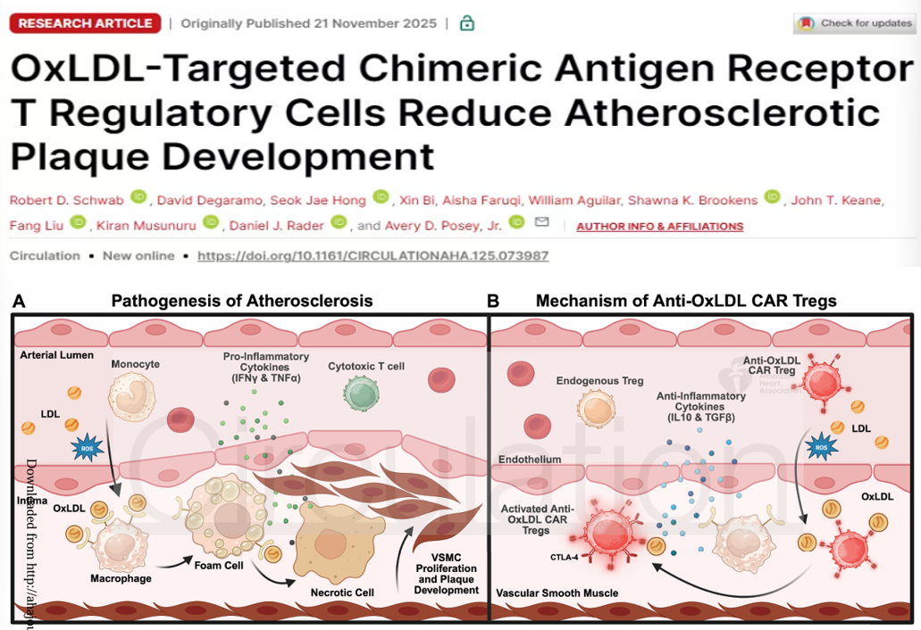 【1】Schwab RD, Degaramo D, Hong SJ, Bi X, Faruqi A, Aguilar W, Brookens SK, Keane JT, Liu F, Musunuru K, Rader DJ, Posey AD Jr. OxLDL-Targeted Chimeric Antigen Receptor T Regulatory Cells Reduce Atherosclerotic Plaque Development. Circulation. 2025 Nov 21. doi: 10.1161/CIRCULATIONAHA.125.073987. Epub ahead of print. PMID: 41268661.