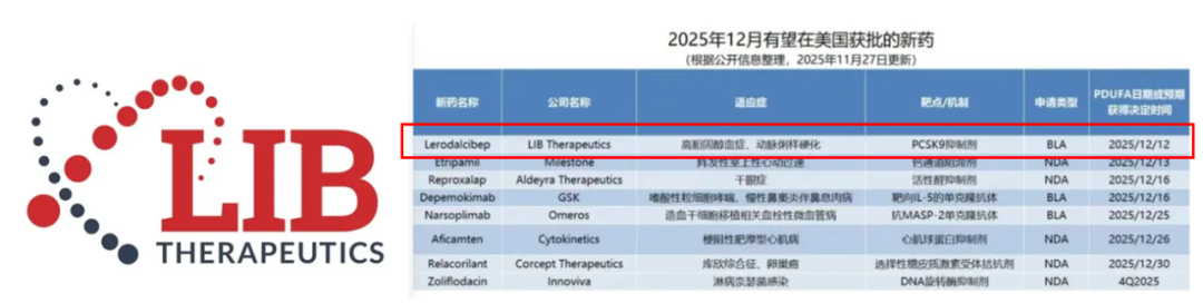 LIB Therapeutics公司研发的第三代PCSK9抑制剂Lerodalcibep,FDA审批的PDUFA日期定为2025年12月12日。目前虽已有多款PCSK9单抗(如依洛尤单抗、阿利西尤单抗)获批上市,但Lerodalcibep凭借独特的技术设计,在疗效、便利性和安全性上形成显著差异化,为他汀治疗不佳的患者提供新选择。PCSK9领域的研发已从单抗向更长效的小核酸药物延伸,诺华Inclisiran等产品的成功,已开启血脂管理的“长效时代”。