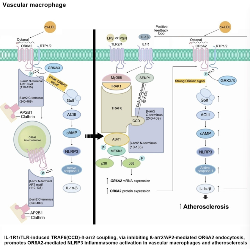 2025年12月3日,团队在Cell Reports发表的研究“Interleukin-1/Toll-like receptor signaling potentiates macrophage olfactory receptor 2-driven atherosclerosis”,首次阐明嗅觉受体OR6A2在动脉粥样硬化进展中的关键作用。嗅觉受体传统认为主要存在于鼻腔,而该研究首次发现其在血管巨噬细胞中存在功能性表达,且激活后会显著加剧炎症反应,直接推动动脉粥样硬化发展。研究进一步明确,OR6A2的配体——辛醛(一种脂质过氧化产物)可在氧化低密度脂蛋白中检测到,而氧化低密度脂蛋白本身就是动脉粥样硬化的核心危险因素之一。值得关注的是,支架蛋白β-抑制蛋白2(βarr2)是炎症调控的“天然刹车手”:它通过与OR6A2结合促进其内吞内化(即“关闭”OR6A2活性),进而抑制巨噬细胞内NLRP3炎症小体激活(炎症是动脉粥样硬化斑块形成的核心驱动力),最终减少促炎因子释放,延缓病变进展。
