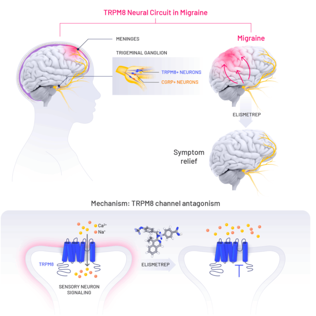 作为首个临床验证的偏头痛TRPM8 拮抗分子,该靶点(表达于支配硬脑膜的三叉神经神经元,基因多态性关联发病风险)区别于主流 CGRP 靶点,有望填补仅30% 单药有效的临床需求缺口,公司计划 2026 年启动注册研究。