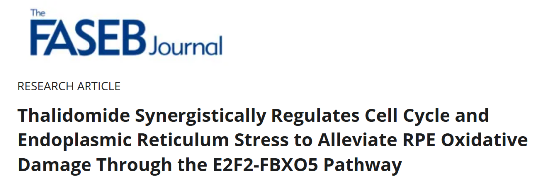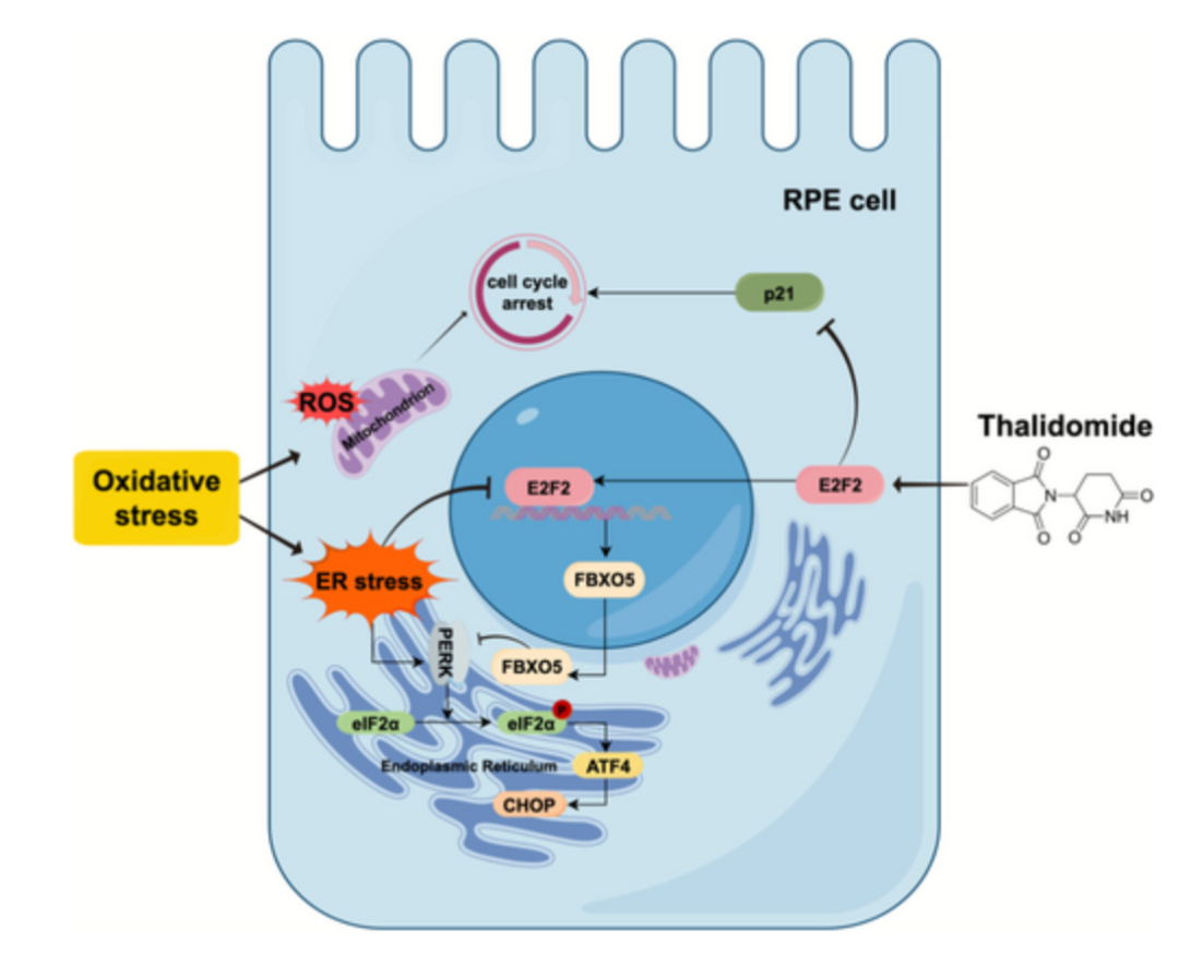 研究证实,沙利度胺可精准作用于视网膜色素上皮(RPE)细胞——该细胞的功能损伤是干性AMD进展的核心环节。具体而言,沙利度胺能够恢复RPE细胞的线粒体功能,缓解细胞G2/M期周期停滞,同时抑制氧化损伤引发的持续性内质网应激;其核心作用机制为激活转录因子E2F2,进而调控FBXO5的表达。动物实验进一步验证了这一结论:沙利度胺可改善氧化应激诱导的视网膜结构异常,延缓RPE细胞退化,同时提升模型小鼠的视觉功能。