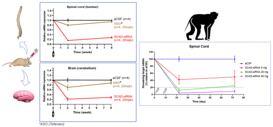 双链siRNA想穿透血脑屏障、精准靶向CNS,难度极大,这曾是神经RNA疗法难以跨越的生死线。中美瑞康的巧思就在于,创新性迁移ASO(反义寡核苷酸,Antisense Oligonucleotide)自递送优势,给siRNA过客链偶联上ACO(辅助寡核苷酸,Auxiliary Oligonucleotide),再搭配化学修饰与柔性连接臂,不依赖病毒或高分子载体,就高效渗透到脑与脊髓,还同时覆盖神经元、胶质细胞等多类靶点,既保护病变细胞,又调控神经微环境。