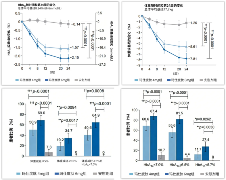 相较于单靶点GLP-1药物司美格鲁肽,玛仕度肽组在血糖达标且体重降幅≥10%的比例(提升约18个百分点)、平均体重降幅(增加1.23kg)、肝脏脂肪含量降幅(提升9.7个百分点)上均显著更优。