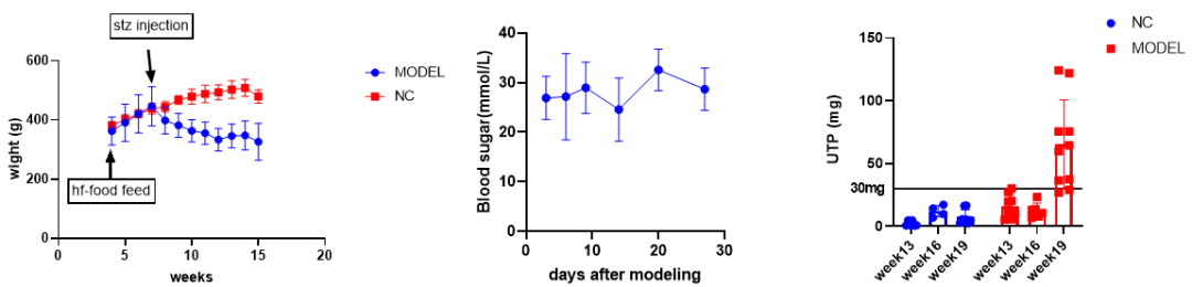 在week19时模型组24h尿蛋白普遍达到30mg以上,符合DN模型尿蛋白排泄率增加的特征。