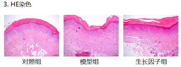 皮肤创面HE染色,对照组:真皮层新生毛细血管数量较少,组织间隙少量充血,成纤维细胞和纤维细胞数量较少,胶原纤维较少,模型组:真皮层中毛细血管丰富,毛细血管周围散布大量成纤维细胞,纤维细胞数量较少,胶原纤维较多,局部出现炎症细胞浸润。生长因子组:毛细血管周围散布着很多成纤维细胞,细胞浸润情况较模型组低。