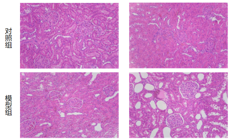 肾脏HE染色结果,对照组肾组织结构正常;模型组均可见肾小管水肿扩张,毛细血管出血,但未见明显炎性细胞浸润,符合糖尿病肾病的病理特征。