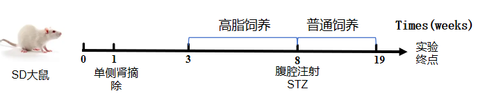 造模方式:单侧肾切除后,高糖高脂饲料持续饲养,于第8周进行STZ腹腔注射,诱导II型糖尿病。