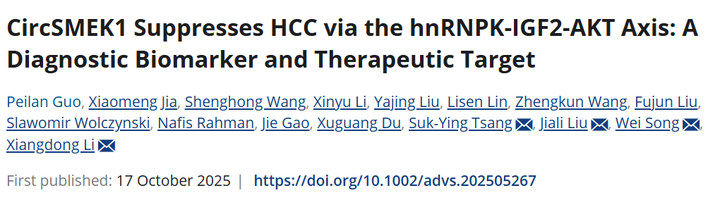 核心机制:circSMEK1通过hnRNPK-IGF2-AKT轴发挥肿瘤抑制作用,其血清水平对HCC无创诊断的曲线下面积(AUC)达0.790,对早期HCC及高危MASH亦有潜在诊断价值。动物实验中,恢复circSMEK1可显著抑制肿瘤生长转移,联合IGF2抑制剂疗效更佳,相关干预策略已进入药企早期研发管线,聚焦MASH相关肝癌的一级预防。