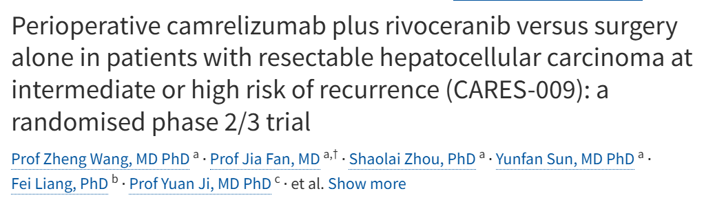 2025年《柳叶刀》发表的CARES-009 Ⅲ期研究,为可切除肝癌围术期治疗带来里程碑突破,中国原研方案登顶国际顶刊。该研究由樊嘉院士指导、周俭教授牵头,采用恒瑞医药“双艾”方案(卡瑞利珠单抗+阿帕替尼)构建“新辅助+手术+辅助”三明治疗法。