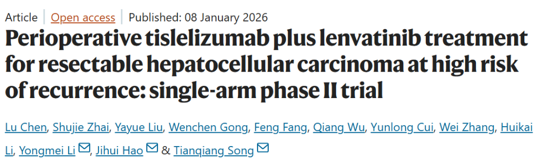 该前瞻性单臂Ⅱ期临床试验,系统评估了PD-1抑制剂替雷利珠单抗联合仑伐替尼在围术期的安全性与疗效,同时构建人工智能疗效预测模型。研究证实该方案可行性优异,可有效降低术后复发风险,为临床筛选获益人群、优化围术期治疗策略提供循证依据。郝继辉教授、宋天强教授、李咏梅教授为共同通讯作者。