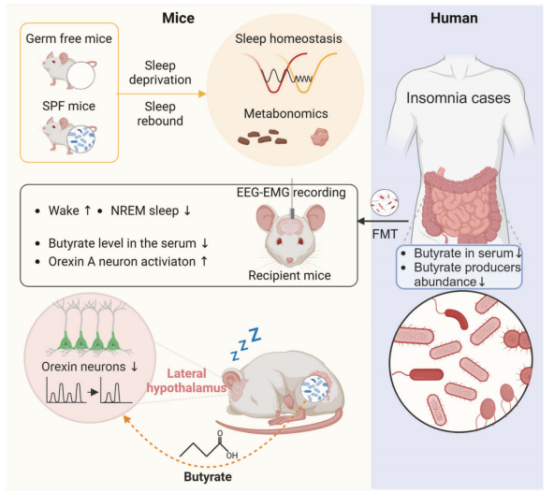 中国科学院院士、北大六院院长陆林团队于2024年12月在Molecular Psychiatry发表研究显示,失眠患者血清丁酸盐水平显著偏低,将失眠患者肠道菌群移植给无菌小鼠,会直接诱导小鼠出现失眠样行为。