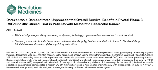 2026年4月13日,Revolution Medicines正式官宣,其耗时多年、豪掷20亿美元押注的核心管线药物Daraxonrasib(研发代号RMC-6236),针对转移性胰腺导管腺癌(PDAC)的关键III期临床试验RASolute 302,中期分析圆满达成全部主要终点,拿下注册性临床成功。