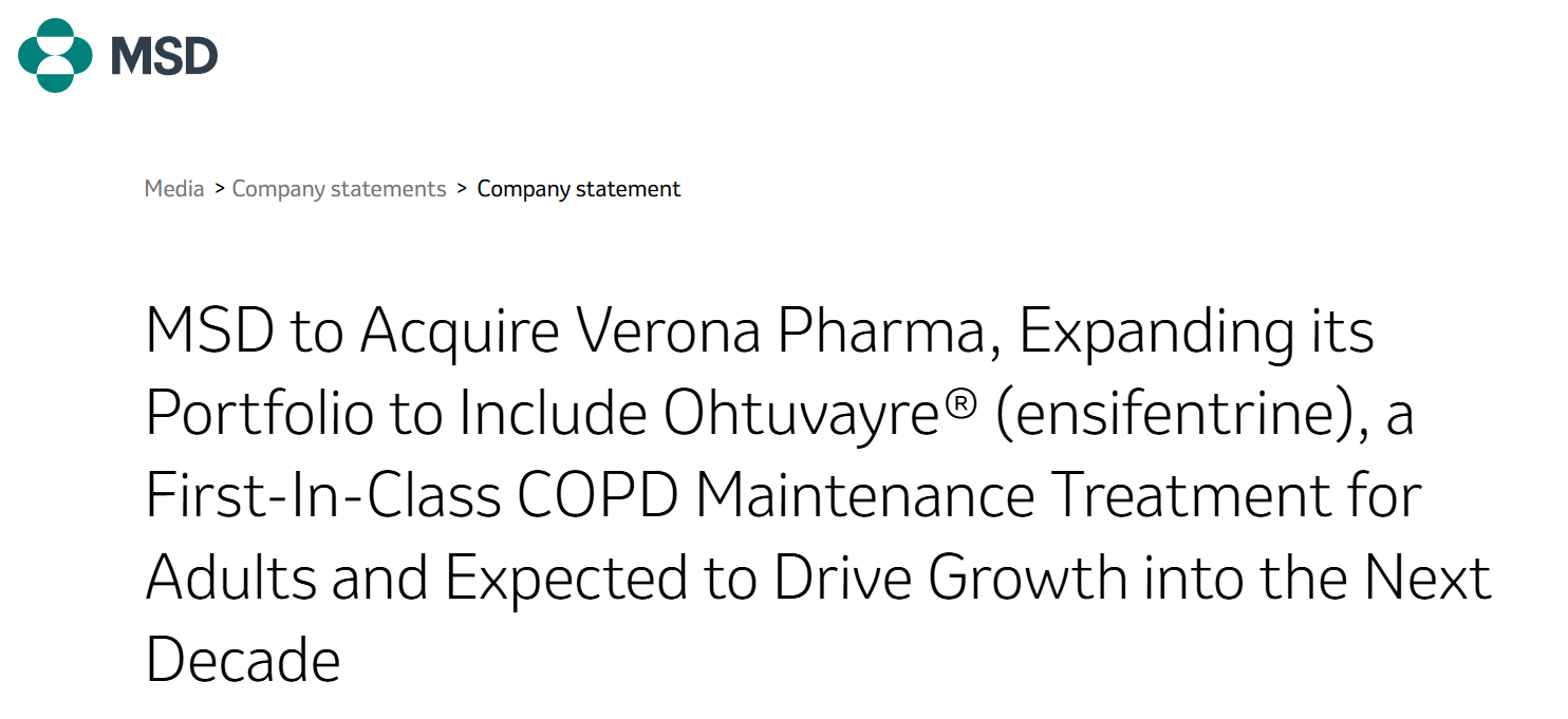7月9日,美国制药巨头默沙东对外宣布将以约100亿美元收购专注于呼吸系统疾病的英国生物制药公司Verona Pharma,通过此次收购,默沙东将获得Verona Pharma的慢性阻塞性肺疾病治疗药物 OhtuvayreTM(药物名:Ensifentrine),用于加强其慢性阻塞性肺病(COPD)治疗药物管线。