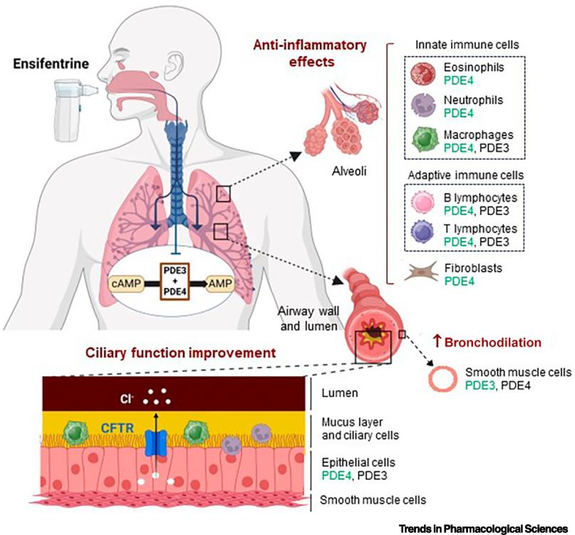 Ensifentrine是一种首创的选择性磷酸二酯酶3和4(PDE3和PDE4)双重抑制剂,通过抑制PDE3升高cAMP,舒张气道平滑肌,而同时抑制PDE4减少炎性细胞激活与迁移,兼具支气管扩张和非甾体抗炎作用,用于成人慢性阻塞性肺病(COPD)的维持治疗[1]。该药于2024年6月获得美国食品药品监督管理局(FDA)批准,是二十多年来首个用于COPD治疗的全新吸入机制药物。目前,该药也在临床试验中评估用于治疗非囊性纤维化支气管扩张症。有预测显示,到2030年代中期,该药物年销售额最高或达到近40亿美元。
