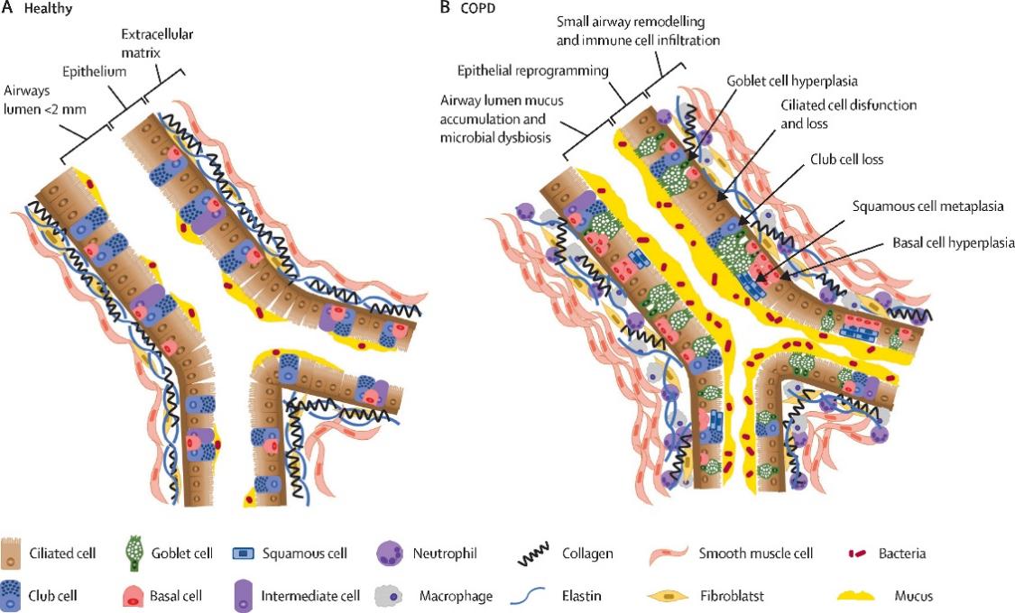 适应性免疫反应和微生物环境的变化在COPD中是至关重要的,细胞介导的适应性免疫反应将炎症导向四种主要极化反应:1型(T1;干扰素驱动,通常被认为是对病毒的反应);2型(T2;IL-4、IL-5和IL-13驱动,对蠕虫或过敏原的反应);17型(T17;IL-17和IL-22驱动,对细胞外细菌的应答);和T调节性(调节性T细胞,抗炎)。气道中T17驱动的炎症标志物增加与肺气肿、中性粒细胞炎症和对吸入性皮质类固醇(ICS)无反应有关[4,5]。T2炎症的基因组标志物与嗜酸性粒细胞(主要T2效应细胞之一)的增加和更好的ICS反应相关[6]。嗜酸性粒细胞计数是第一个添加到慢性阻塞性肺病全球倡议(GOLD)指南中的血液生物标志物,有证据表明它有助于确定ICS在有症状的患者中的作用。然而,抗IL-5生物制剂在COPD试验中未达到主要终点[7,8]。单独治疗COPD嗜酸性粒细胞炎症的有效性较低可能是由于重叠的炎症改变或不可逆的肺损伤。衰老的肺也可能更难治疗,因为竞争性的病理改变,如干细胞耗竭(导致再生能力降低)和炎症[9-11]。