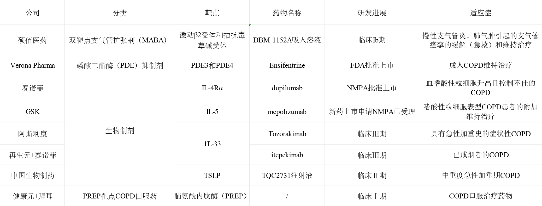 目前COPD主要在研药物靶点(公开数据整理)