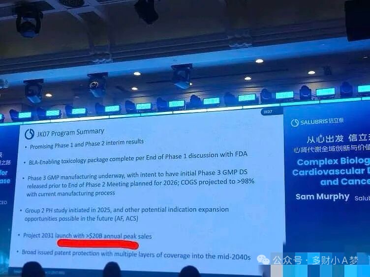 JK07是信立泰旗下子公司位于美国的Salubris Biotherapeutics(简称SalubrisBio)自主研发的一款中美双报的创新药,目前II期临床中期结果良好,预测销售峰值超200亿美金。