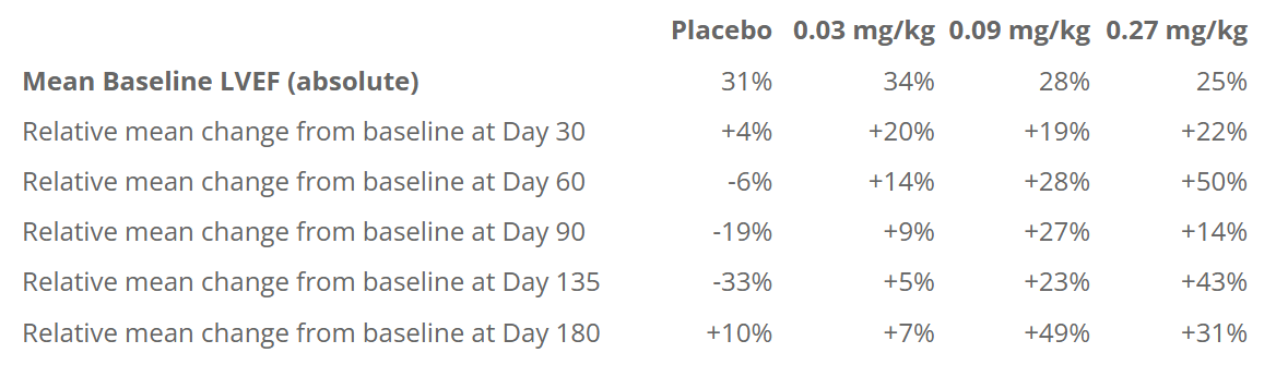结果显示,在中高剂量水平下观察到的射血分数(EF)平均改善 31%,完整的研究结果表明 JK07 耐受性良好,未观察到剂量限制性毒性。在0.27 mg/kg剂量下,给药60天后,LVEF较基线平均改变了50%!