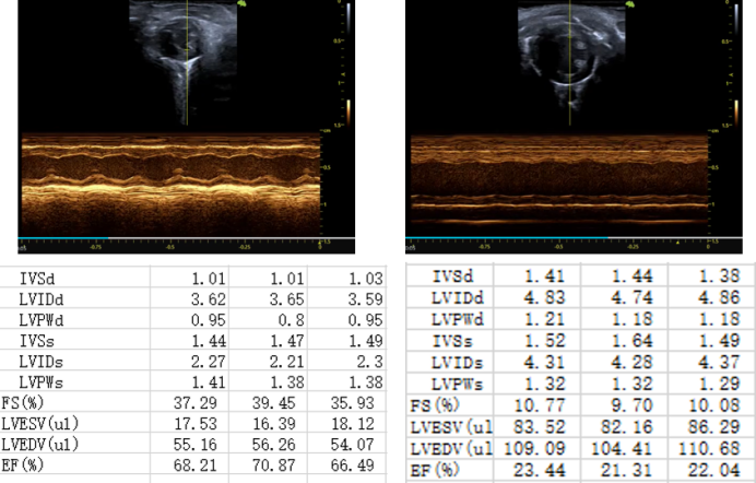 1. 心脏彩超检测分析心力衰竭对大鼠心脏功能的影响,与对照组比较,模型组中,EF百分比下降,具有显著性差异(P<0.05)。