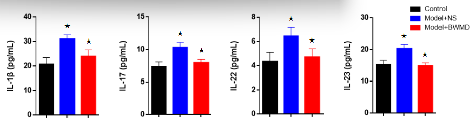 ELISA 检测结果显示,IMQ+NS组小鼠血清中 IL-1β、IL-17、IL-23、IL-22 水平较空白对照组显著升高(P<0.01),IMQ+BWMD 组较IMQ+NS组显著降低(P<0.01)。