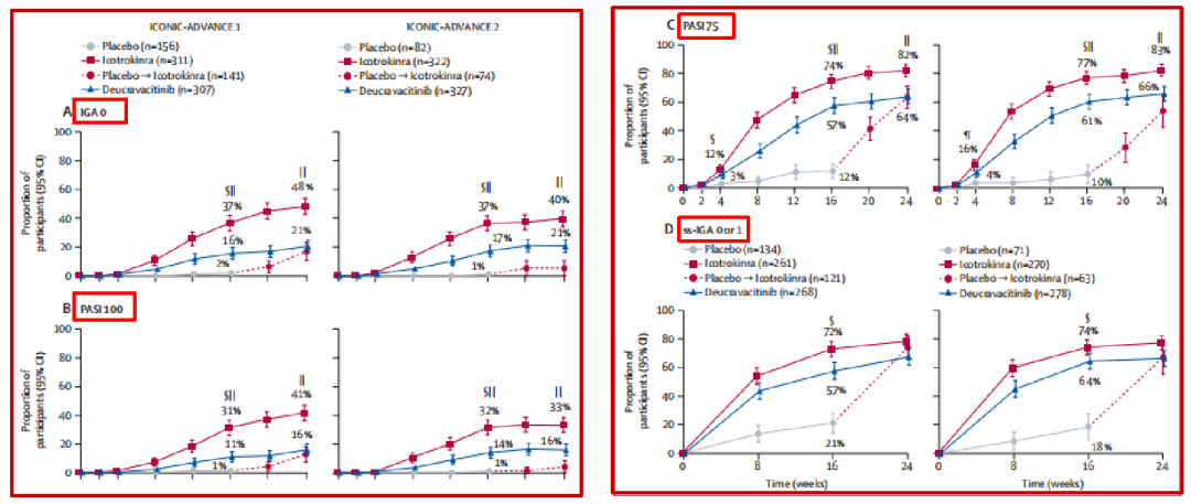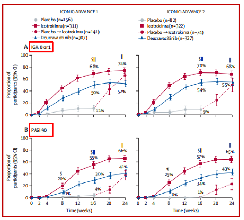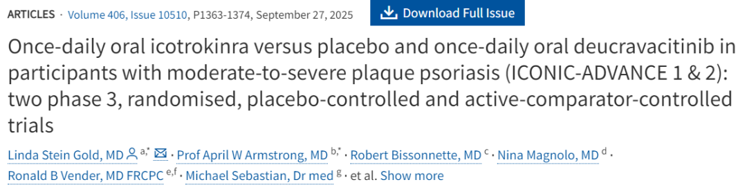 【1】Gold, Linda Stein et al. “Once-daily oral icotrokinra versus placebo and once-daily oral deucravacitinib in participants with moderate-to-severe plaque psoriasis (ICONIC-ADVANCE 1 & 2): two phase 3, randomised, placebo-controlled and active-comparator-controlled trials.” Lancet (London, England) vol. 406,10510 (2025): 1363-1374. doi:10.1016/S0140-6736(25)01576-4.