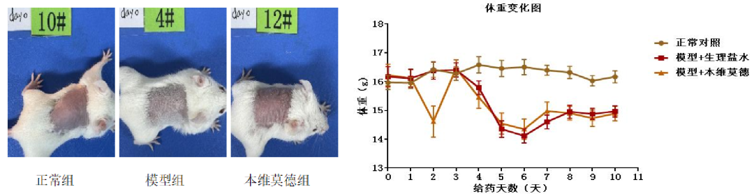 选取健康雄性Balb/c小鼠,在完成规范适应性饲养后,通过专业处理构建皮肤暴露模型。实验采用 “预防性干预 + 同步治疗” 的科学方案:先进行3天预防性护理,随后在模型构建期间持续开展 7 天治疗,每日规范施加对应干预措施。实验中选用本维莫德乳膏作为阳性对照药物,采用每日两次外用涂抹的标准给药方式。