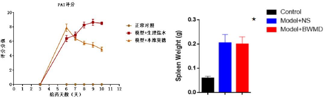 PASI评分结果表明,给药第7-11天,IMQ+NS组较空白对照组显著升高(P<0.01);给药第9-11天,IMQ+BWMD 组较IMQ+NS组显著降低(P<0.01)。取材当天对摘取小鼠脾脏,IMQ+NS组小鼠脾脏重量较空白对照组显著升高,模型组与阳性药物组无明显差异。