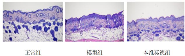HE染色显示,空白对照组皮肤结构正常,IMQ+NS组出现明显角化不全、角化过度、棘层增厚及真皮层炎性细胞浸润、毛细血管扩张,IMQ+BWMD组上述病理改变明显减轻。