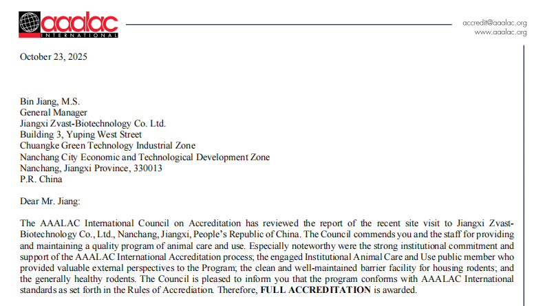中洪博元已成功获得国际实验动物评估和认可委员会(AAALAC)的完全认证!