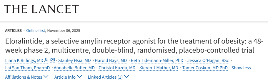 【2】Billings LK, Hsia S, Bays H, Tidemann-Miller B, O'Hagan J, Tham LS, Butler A, Kazda C, Mather KJ, Coskun T. Eloralintide, a selective amylin receptor agonist for the treatment of obesity: a 48-week phase 2, multicentre, double-blind, randomised, placebo-controlled trial. Lancet. 2025 Nov 6:S0140-6736(25)02155-5. doi: 10.1016/S0140-6736(25)02155-5. Epub ahead of print. PMID: 41207310.