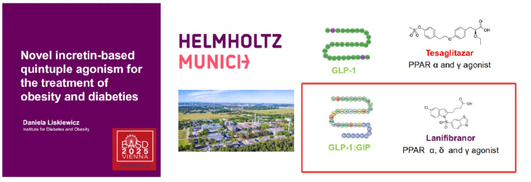 2025欧洲糖尿病研究协会年会(EASD)上刚公布的GLP-1 R/GIPR/ 泛PPAR五重激动剂,它特别巧妙地整合了多种优势机制——结合 GLP-1R/GIPR 共激动的“减重+降糖” 功效与PPAR激动的 “提胰岛素敏感性+调血脂”作用,实现代谢改善的协同增效。药物设计方面,选择lanifibranor作为泛PPAR激动剂,激活三种 PPAR 亚型(α、δ 和 γ)。更为独特的是,这个五重激动剂中的泛PPAR部分能够精准地递送到表达GIP或GLP-1受体的细胞上,避免药物在其他细胞中不必要的作用,从而大大提高药物疗效,降低潜在副作用。