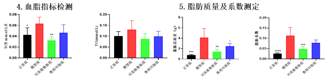 造模:5周龄BALB/c 雄性小鼠适应性饲养1周,正常组给予普通饲料喂养 14 周,自由饮水。模型组给予高脂饲料喂养 14 周,自由饮水。