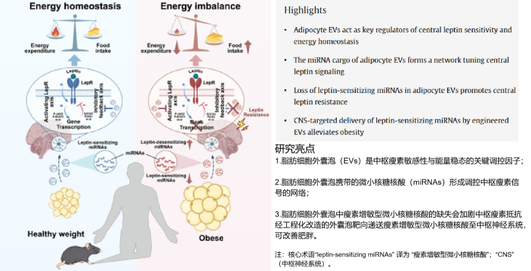 11月11日,南京大学毕艳教授团队在Cell 子刊《细胞・代谢》发表Adipocyte-derived extracellular vesicles are key regulators of central leptin sensitivity and energy homeostasis,首次揭示脂肪组织分泌的细胞外囊泡(EVs)及其携带的微小核糖核酸(miRNAs)是调控大脑瘦素敏感性的关键“信使”。正常情况下,它们能穿越血脑屏障增强瘦素信号,抑制食欲、加速能量消耗;肥胖时这类miRNAs减少,导致大脑瘦素敏感性下降,进而引发体重增加。基于此研究团队创新性地打造了脑靶向外泌体递送系统,可精准递送促瘦素增敏miRNAs,重新激活瘦素信号。