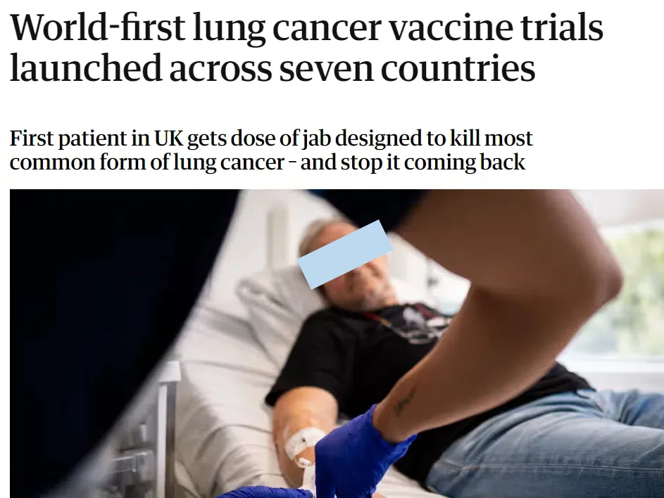 近期,国际各大医疗媒体头版纷纷争相报道一条重磅新闻:世界上第一个 mRNA 肺癌疫苗成功研发,专家们称赞其具有挽救数千人生命的“突破性”潜力。目前,英国首位晚期肺癌患者在放化疗后接种了这款实验性的疫苗,旨在杀死最常见的肺癌并阻止其复发,打一针治疗肿瘤的时代即将到来!