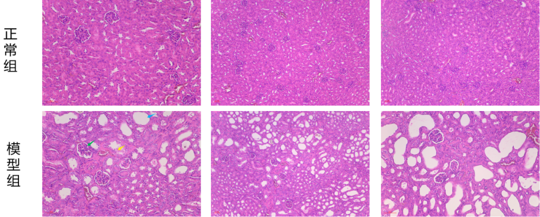 肾小球坍塌(绿色箭头),肾小管上皮细胞脱落(黄色箭头),肾小管扩张(蓝色箭头)。HE染色结果表明:正常组样本肾小球完整,未见明显病理变化。模型组样本均可见肾小管有明显扩张,大部分样本可见肾小球坍塌,部分区域肾小管上皮细胞可见明显脱落。