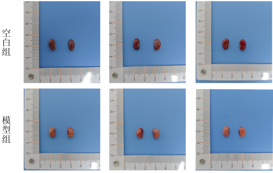 空白组动物肾脏外观光滑,颜色呈红褐色,质地较为柔软;模型组动物肾脏略显肿胀,颜色变浅发白,质地变得较为硬实。