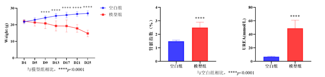 体重结果表明,与模型组相比,空白组动物体重与其有显著性差异(p<0.0001),表明造模对动物体重有显著影响。肾脏指数和血清生化结果表明,与空白组相比,模型组动物肾脏指数和血清中的UREA含量与其有显著性差异(p<0.0001),表明造模成功。