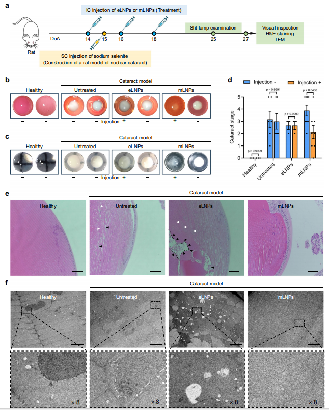 通过硒酸钠诱导核性白内障、半乳糖诱导糖尿病性白内障的 SD 大鼠模型。在白内障形成前后,实验组将负载 hLSS mRNA的pB-UC18 LNPs递送至大鼠晶状体局部,对照组注射同等剂量空载体。结果说明mRNA药物能有效阻止甚至逆转核性白内障的进展。