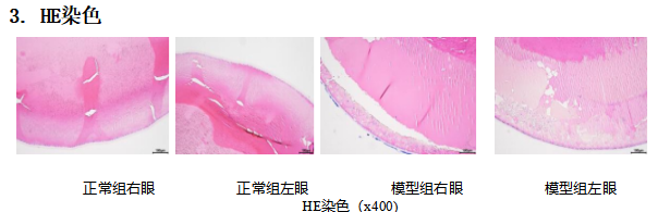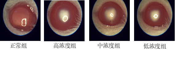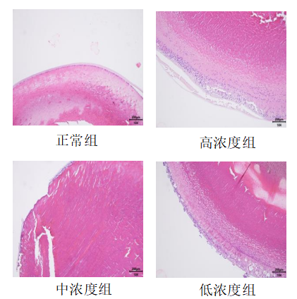 结果:正常组结构正常完整,无明显病理变化,模型组明显可见上皮细胞部分脱落,排列疏松,晶体边缘纤维肿胀,水肿细胞间有空泡形成;中高剂量组的造模效果相对而言要比低剂量好。