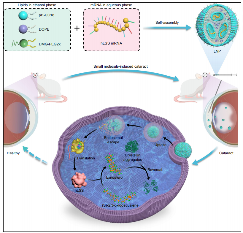 团队开发了一种脂质纳米颗粒(LNP)包裹的mRNA药物,编码名为人源羊毛甾醇合酶(hLSS)的蛋白。这种蛋白可以促进羊毛甾醇(lanosterol)的合成,而羊毛甾醇正是维持晶状体透明、防止蛋白质聚集的关键分子。
